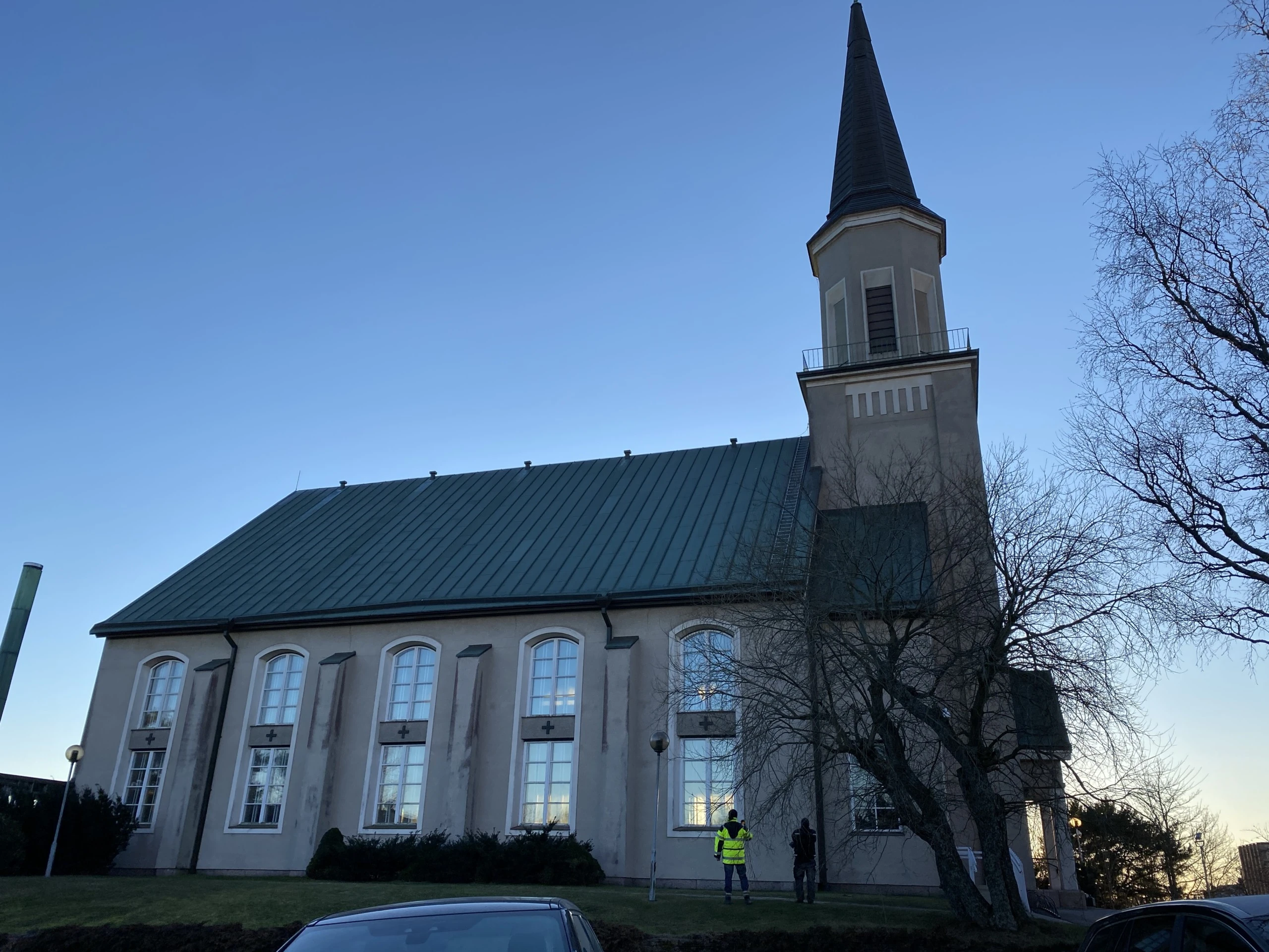Hangon kirkon julkisivun ja vesikaton saneeraus sisälsi kirkontornin ja porrashuoneiden julkisivun paikkarappauskorjauksen ja siihen liittyvien pellitysten sekä varusteiden saneeraustyön sekä kirkkotornin etelän puoleisen porrashuoneen vesikatteen uusimisen.